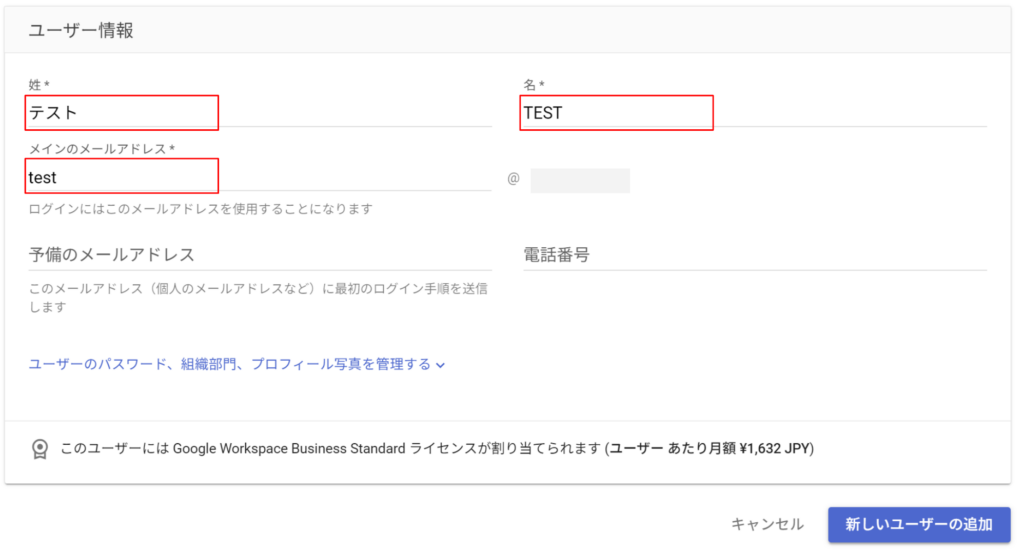 姓、名、メールアドレス(@ より上)を入力して「新しいユーザーの追加」をクリックします。(※メールアドレスは上部で作成したものを入力します。