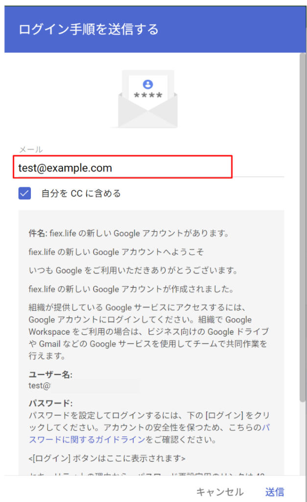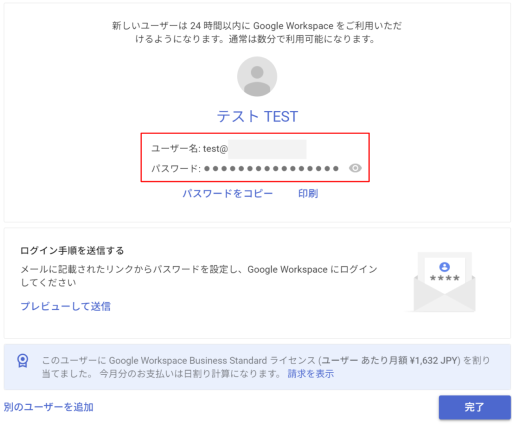 初期PWが自動生成されるので、ユーザー名とパスワードで通常のGoogleにログインします。