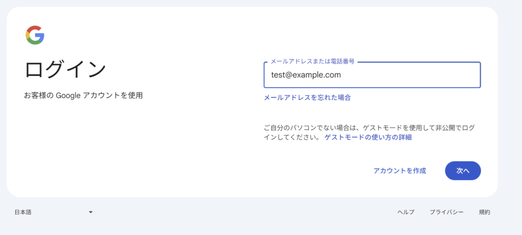 もしくはブラウザで「Google ログイン」と検索すれば出てきます。既に別のアカウントでログイン済みの場合はアカウントを切り替えてください。