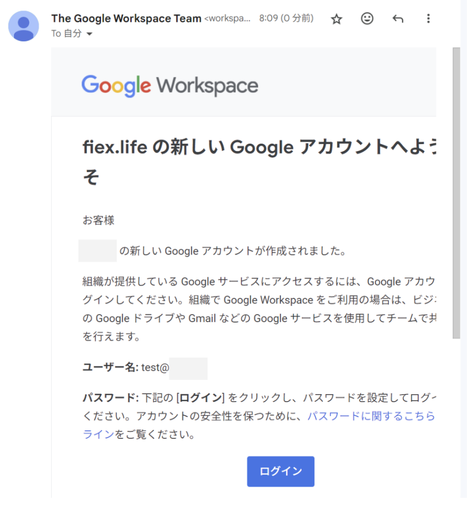 指定したメールアドレスにGoogle Workspaceから以下のメールが届きます。