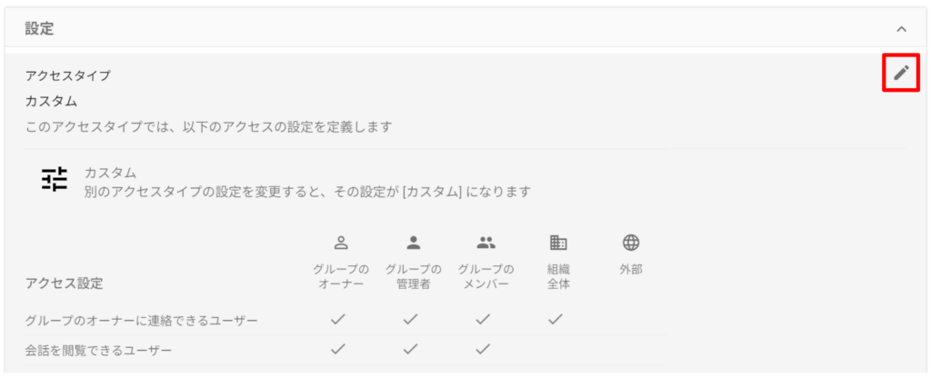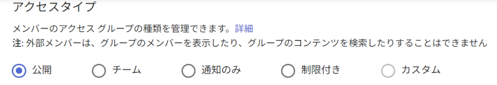 アクセスタイプとは、メンバーを招待したり、グループにメッセージを投稿できる範囲の設定です。(※外部メンバーを追加することもできますが、グループのメンバーを表示したり、グループのコンテンツを検索したりすることはできません)
