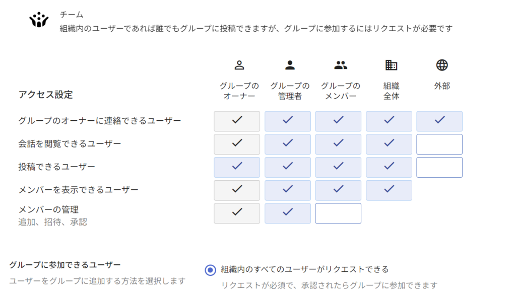 ↓ 「チーム」にするとグループに参加できるユーザーが「組織内のすべてのユーザーがリクエストできる」になります。