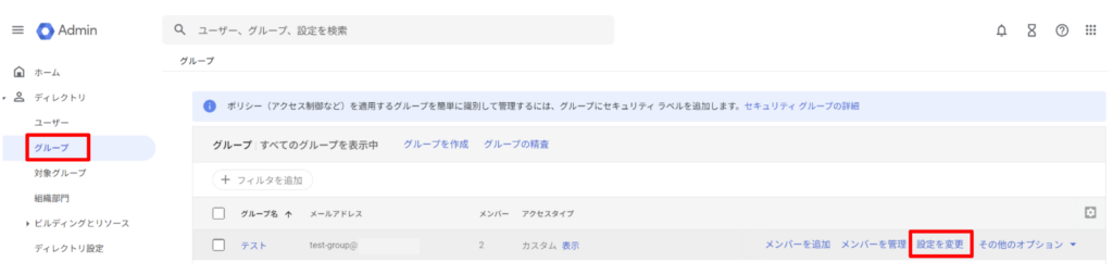 設定を変更するには、「ディレクトリ > グループ」から対象のグループにカーソルを合わせ、「設定を変更」をクリックします。
