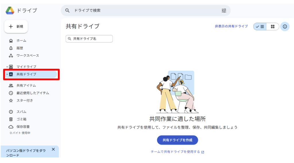 Googleドライブの「共有ドライブ」で、共有用のドライブを作成することができます。