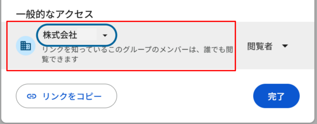原因はGoogleドライブの共有(アクセス権)の「一般的なアクセス」がGoogle Workspaceのアカウントになっているためです。