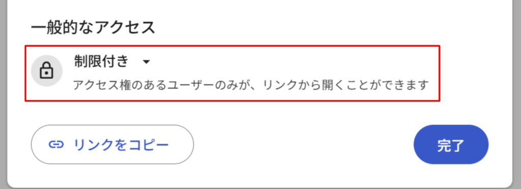 対象のGoogleドライブのフォルダやファイルの共有設定で「一般的なアクセス」の設定を「制限付き(アクセス権のあるユーザーのみが、リンクから開くことができます)」に変更します。