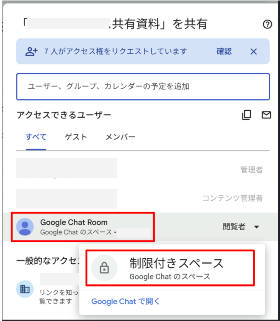Google ChatにGoogleドライブのフォルダやファイルを投稿すると通常はスペースの参加者がファイルにアクセスできるようになります。